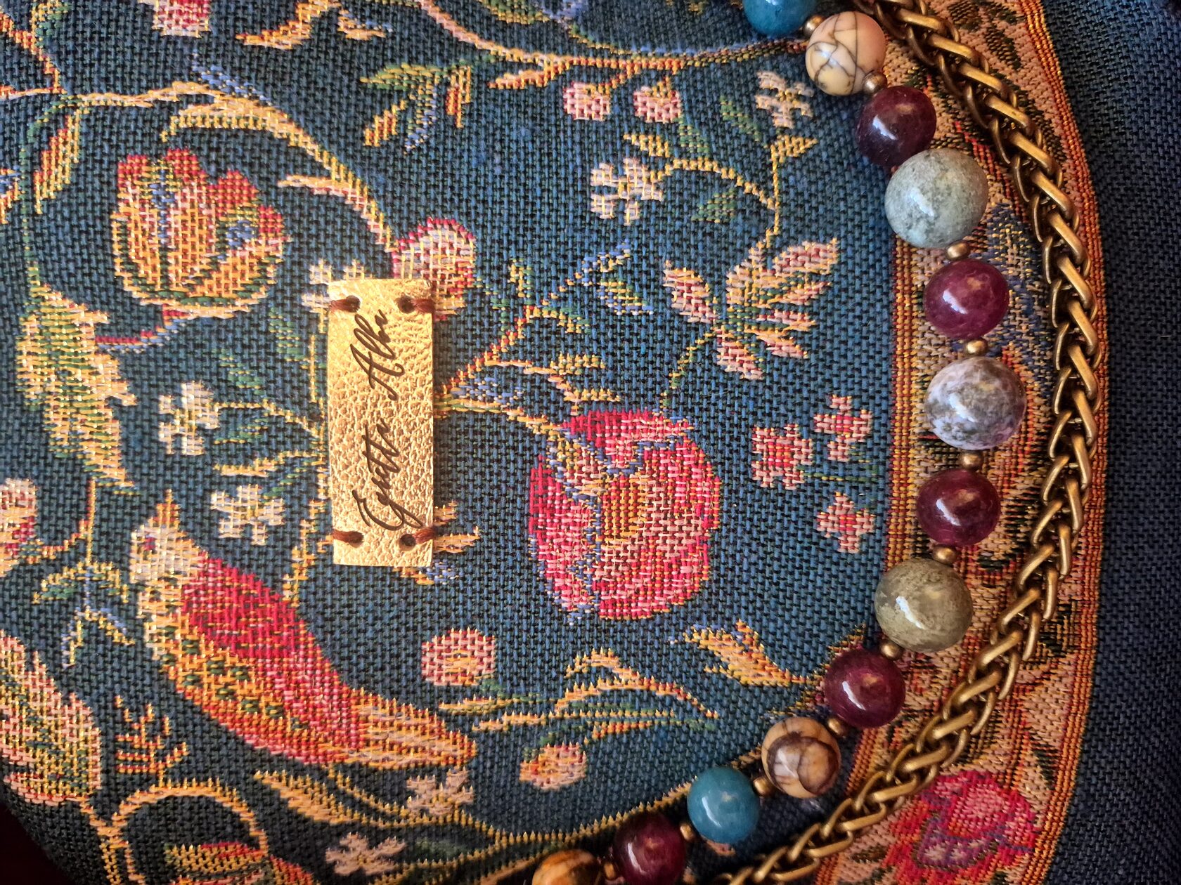 Фермуар, цепочка: бронзированный металл. Корпус: гобелен, бархат. Шильд: натуральная кожа. Бусины декоративной ручки: апатит, гранат, яшма Пикассо