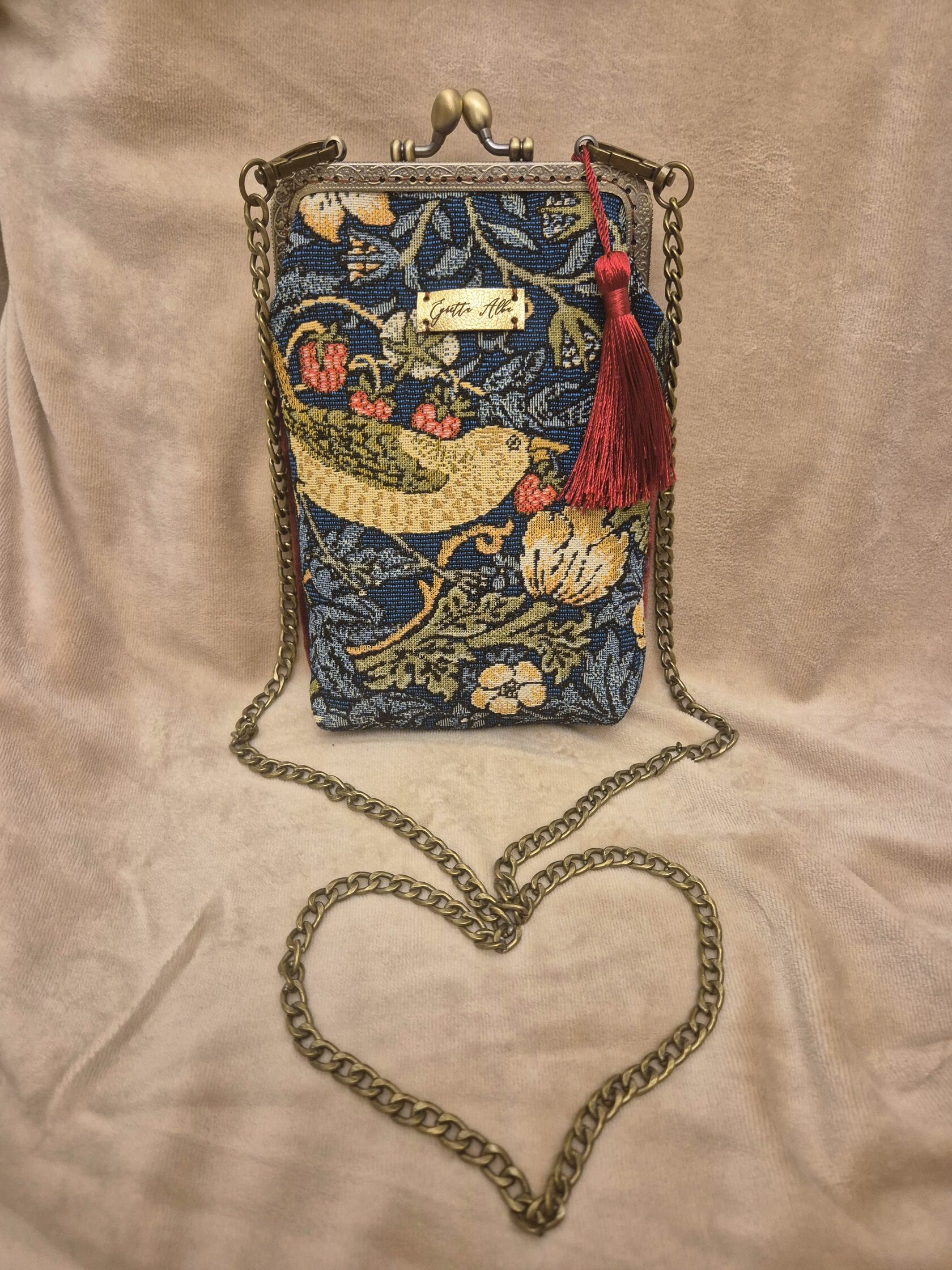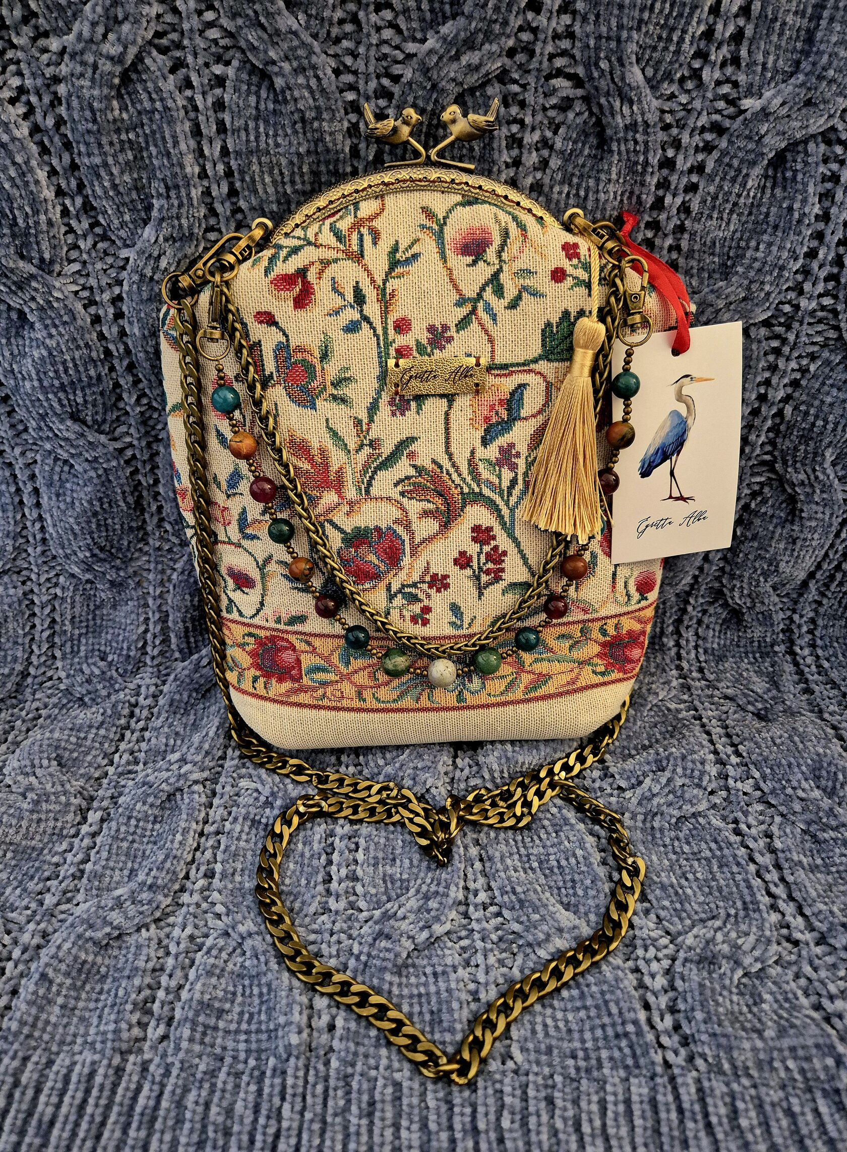 Фермуар, цепочка: бронзированный металл. Корпус: гобелен. 25×25×12. Шильд: натуральная кожа. Ремень (по желанию): натуральная кожа.