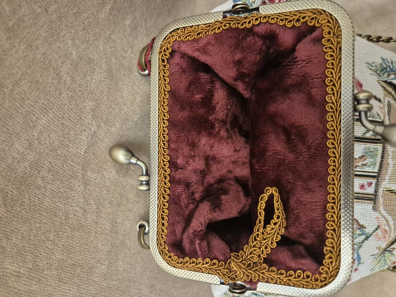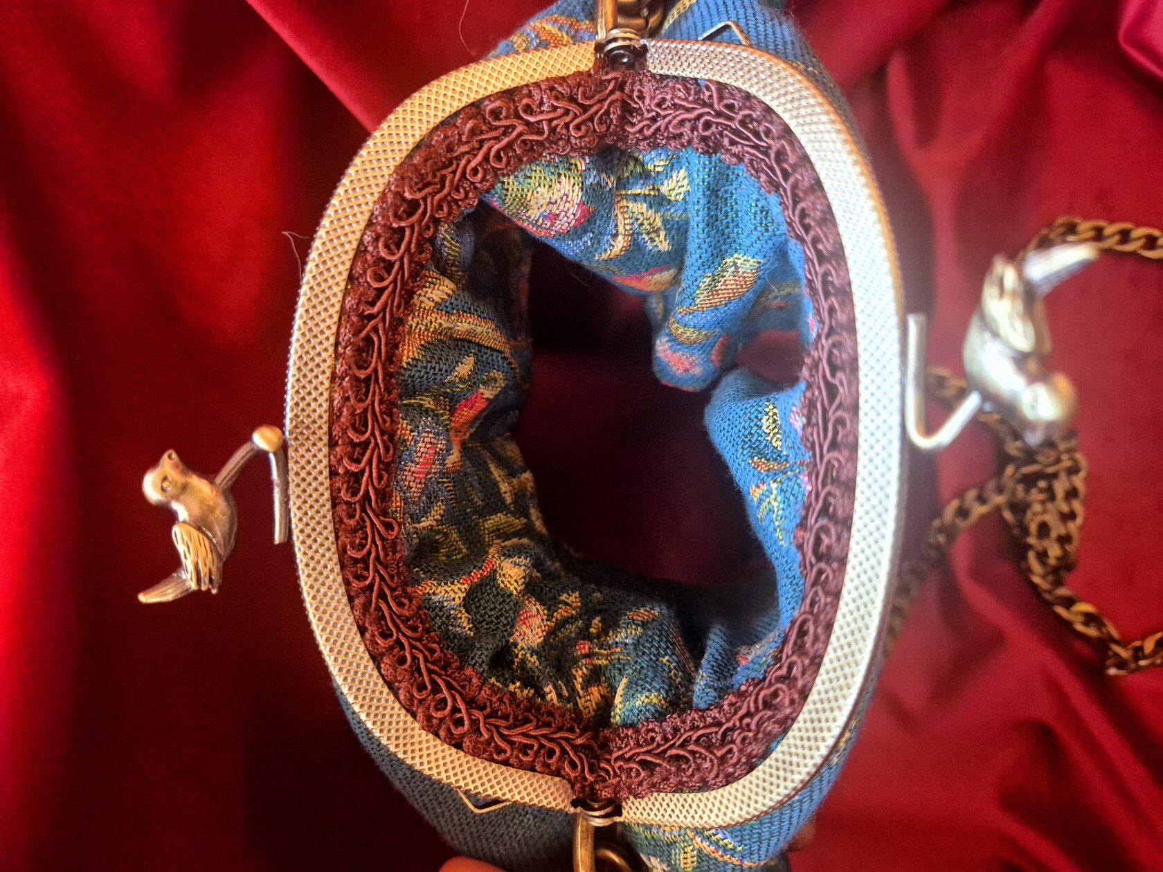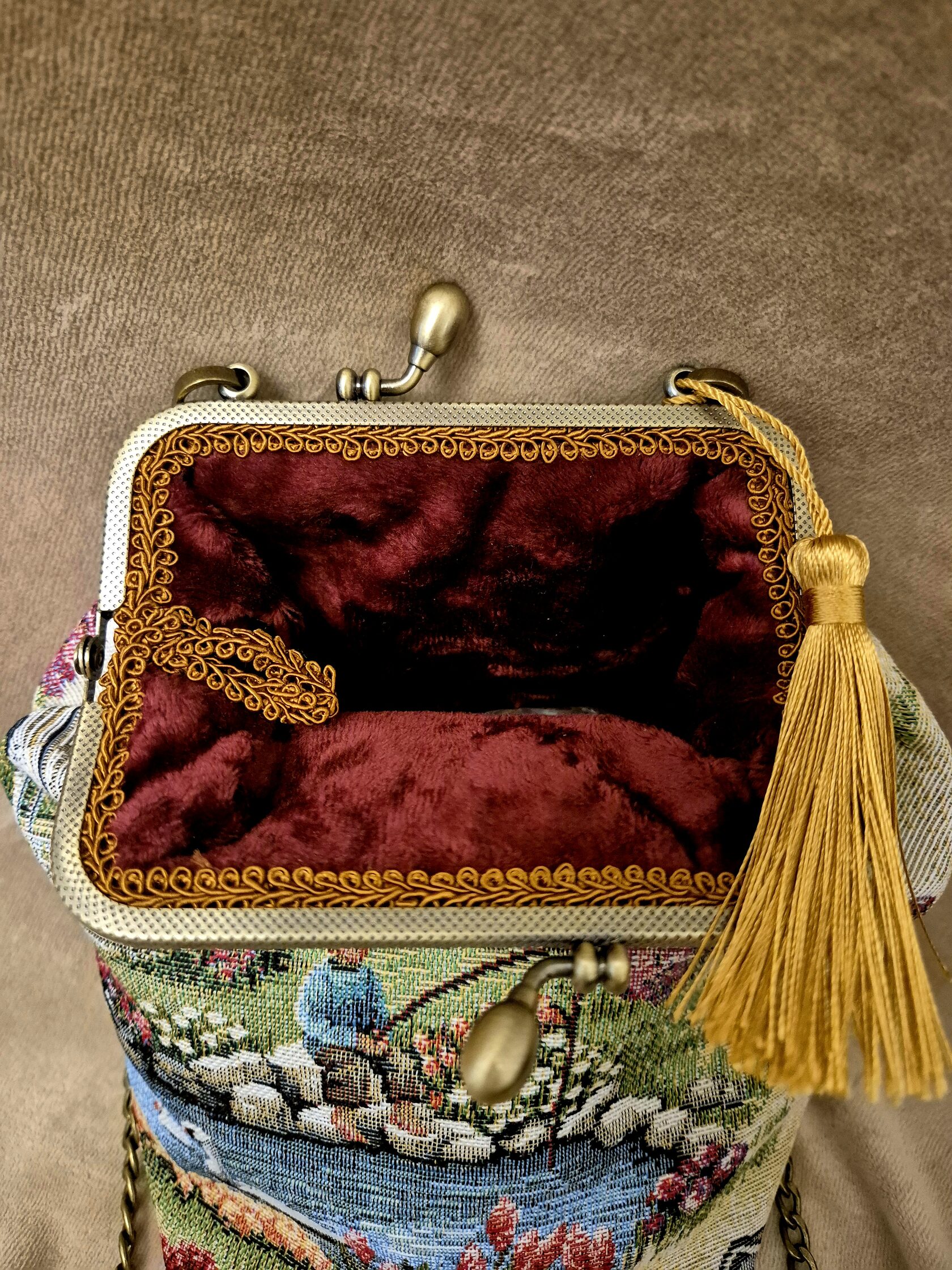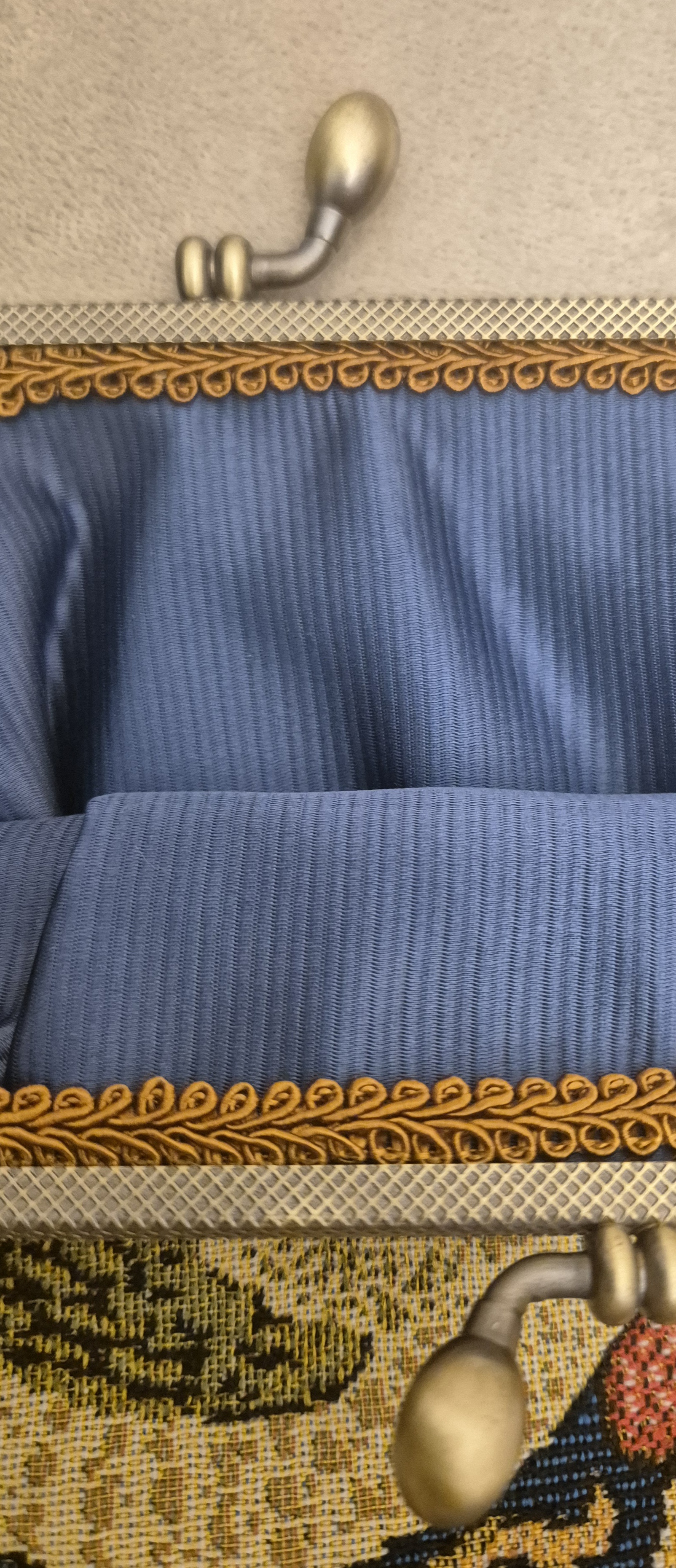 Фурнитура: бронзированный металл. Корпус: гобелен, атлас. Шильд: натуральная кожа.
