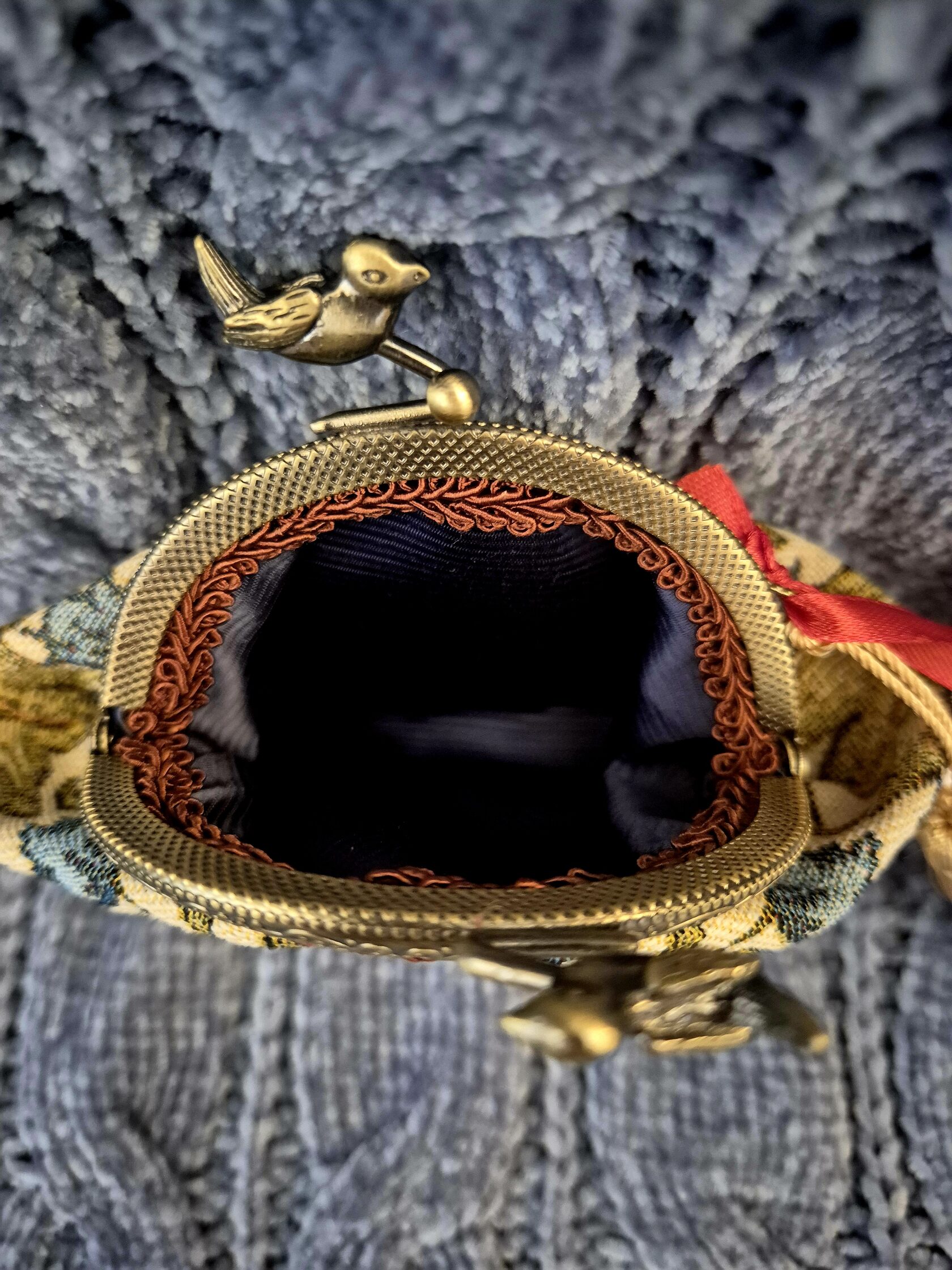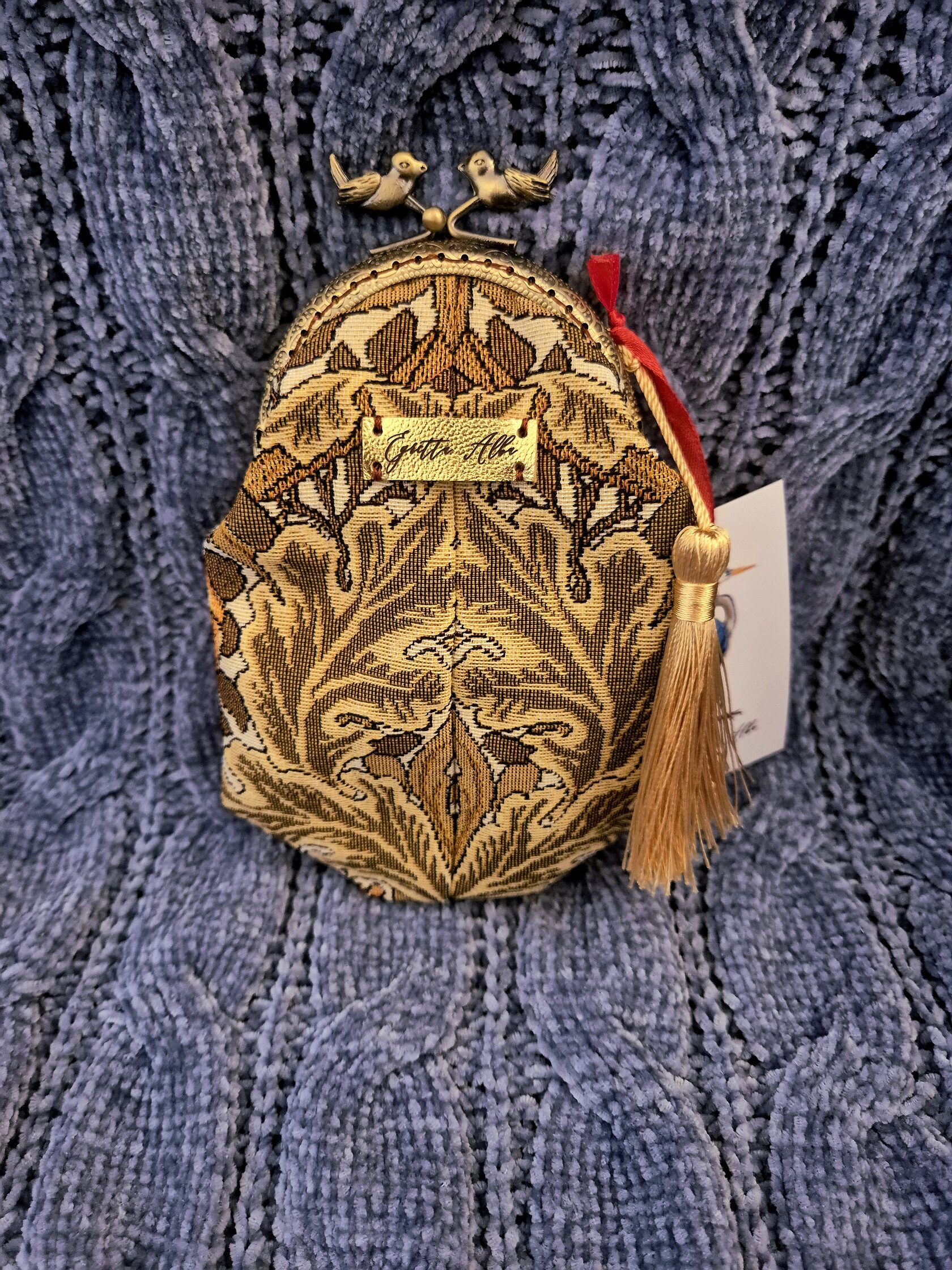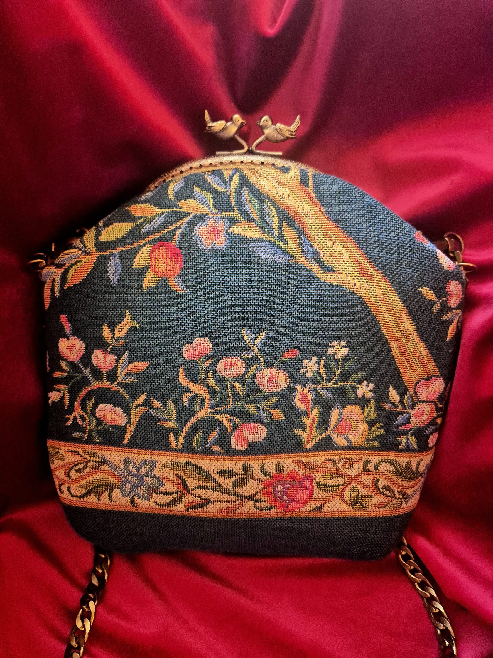 Фурнитура: бронзированный металл. Корпус: гобелен, атлас. Шильд: натуральная кожа.
