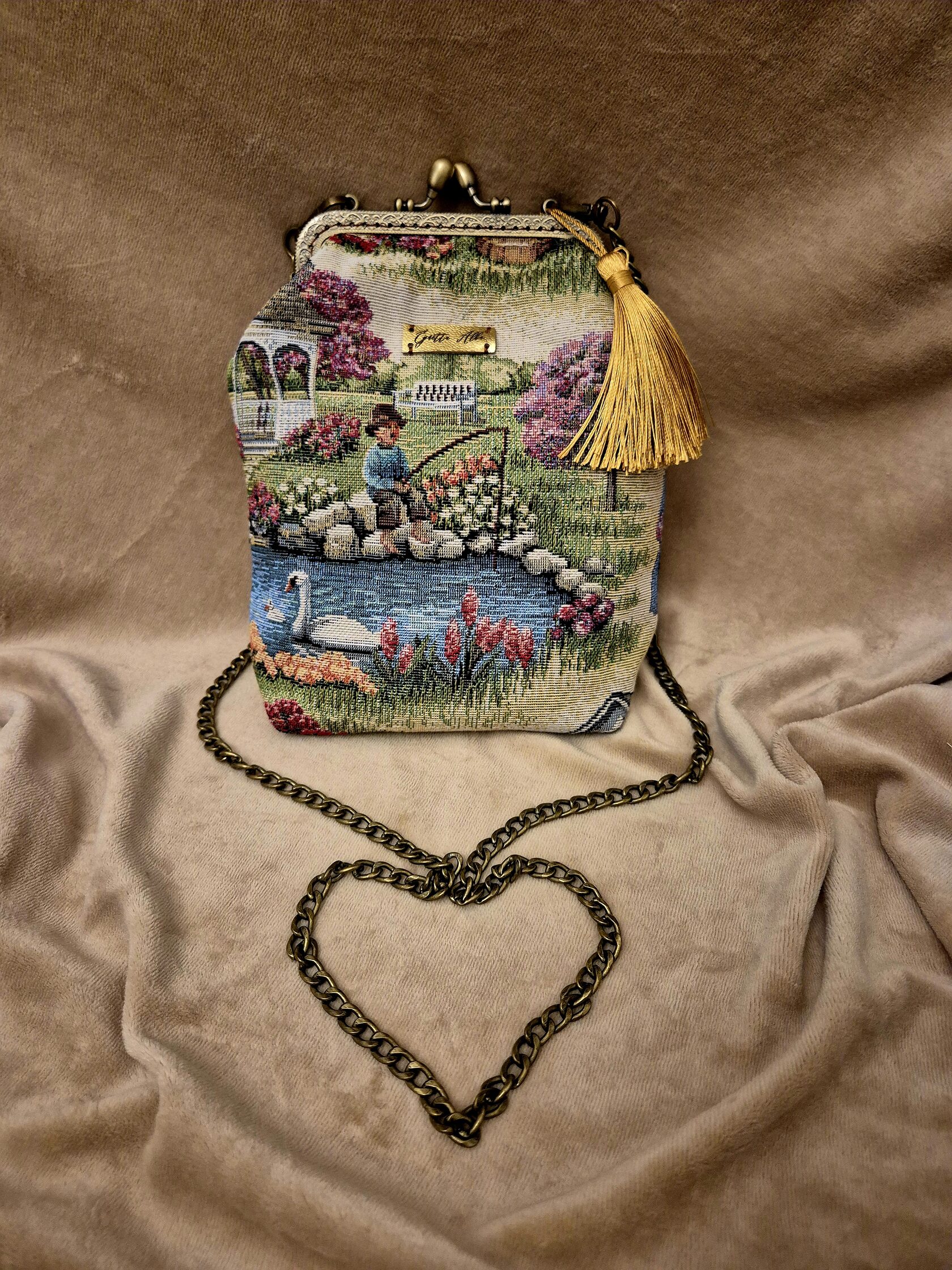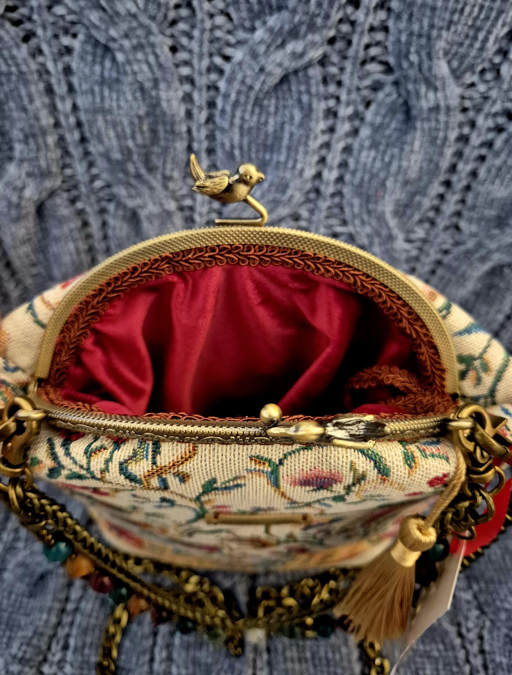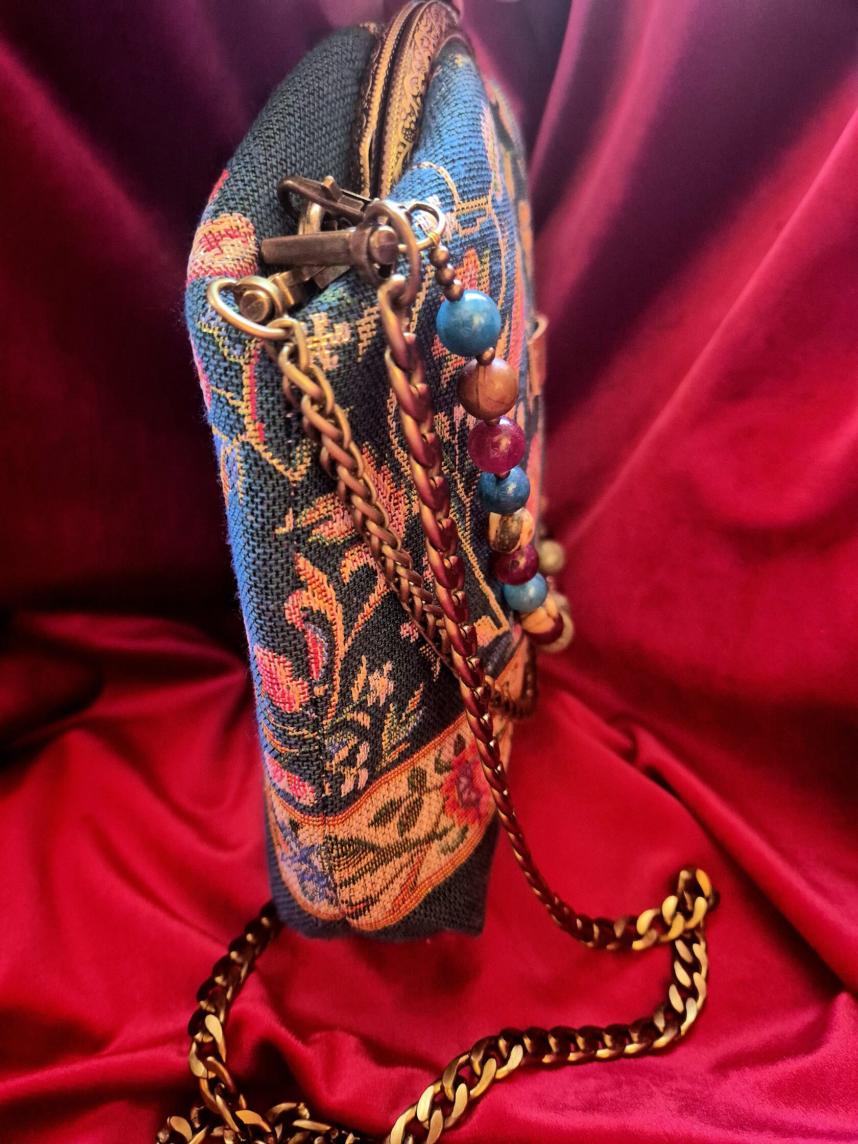 Фермуар, цепочка: бронзированный металл. Корпус: гобелен, атлас.12×12×5,5. Шильд: натуральная кожа.