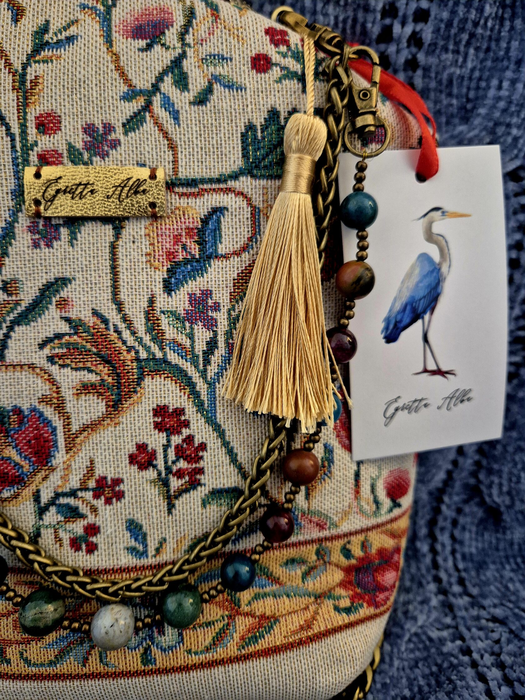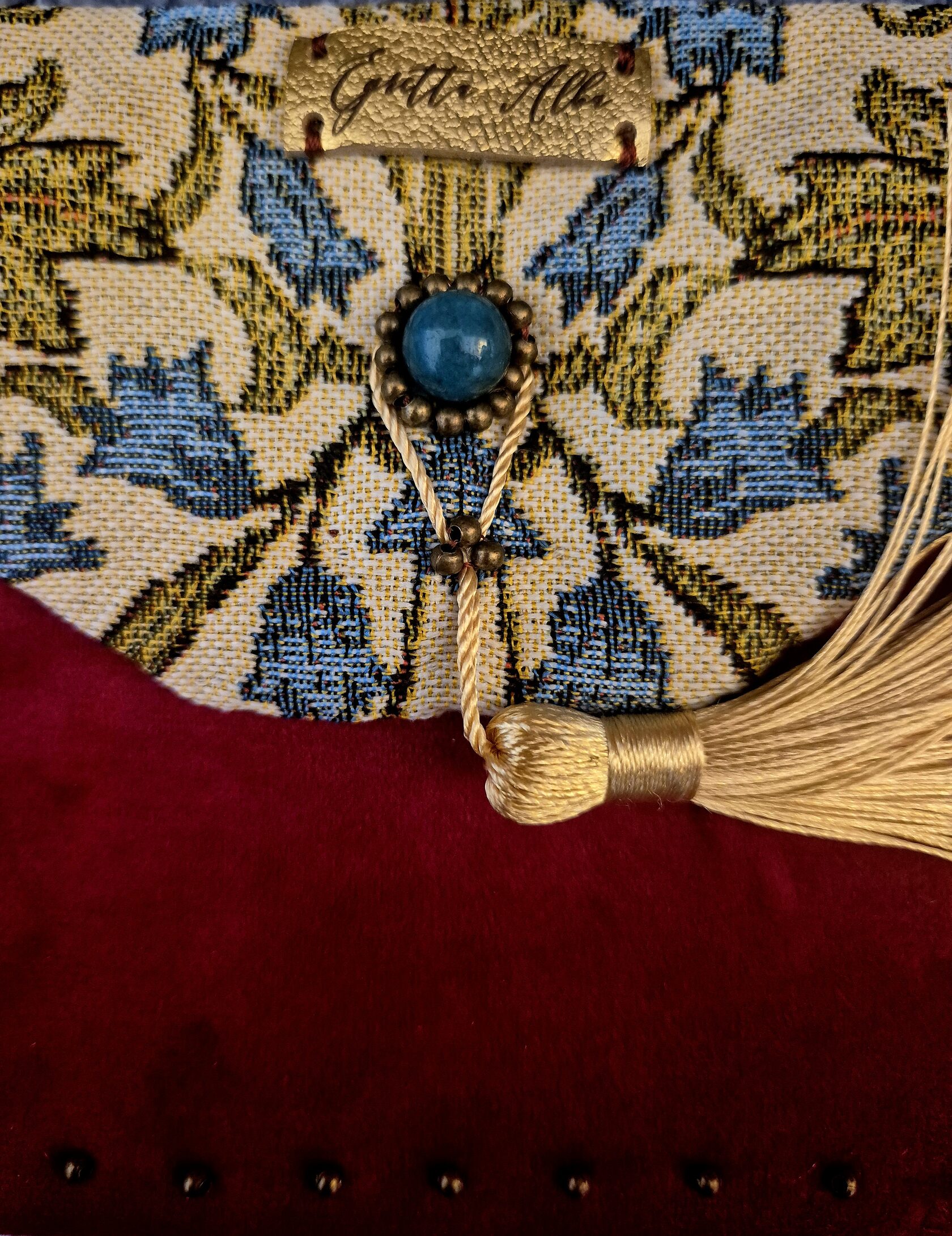 Фурнитура: бронзированный металл. Корпус: гобелен, бархат. Шильд: натуральная кожа. Бусина: апатит