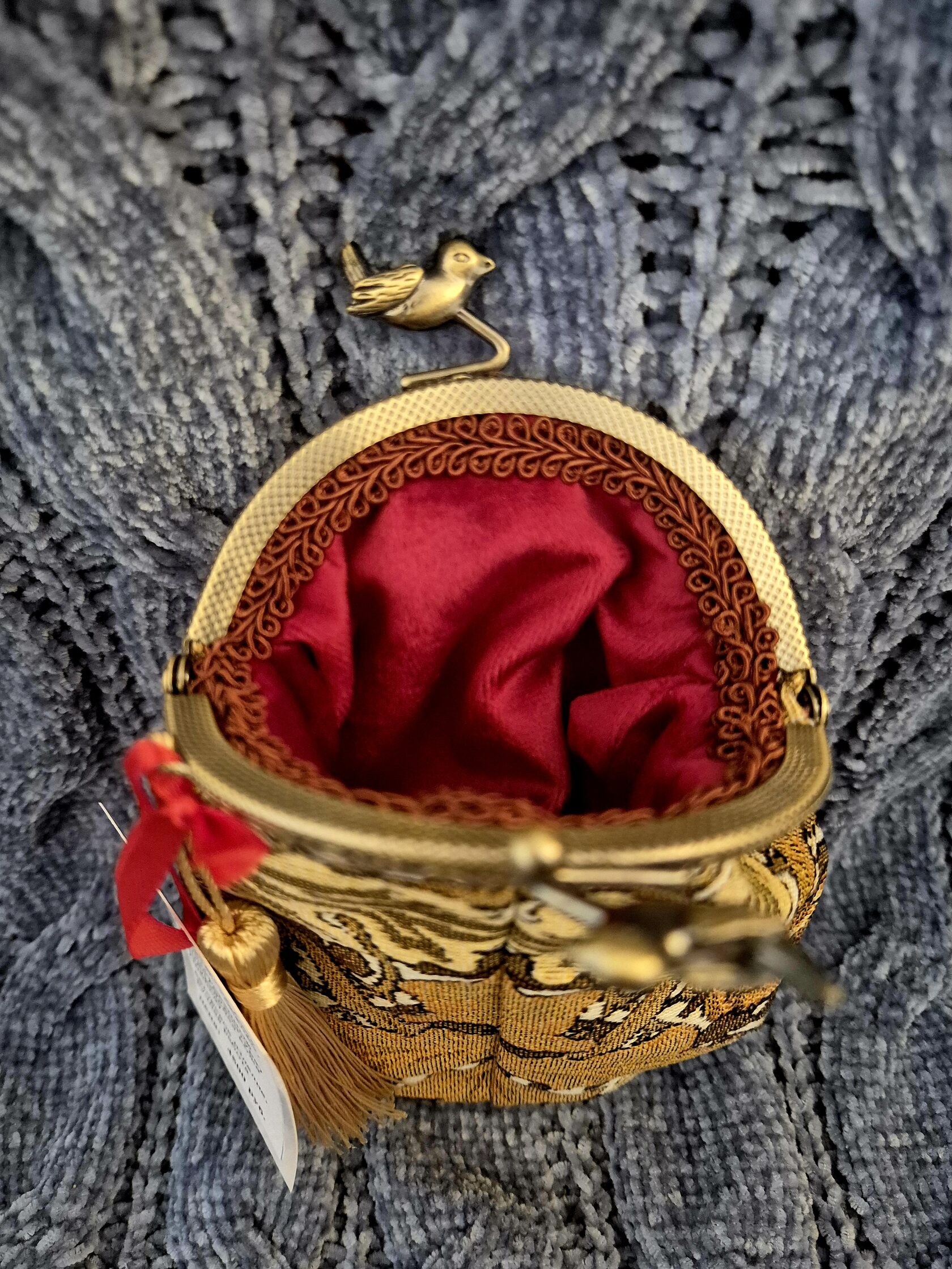 Фермуар, цепочка: бронзированный металл. Корпус: гобелен, атлас.15×13,5×5