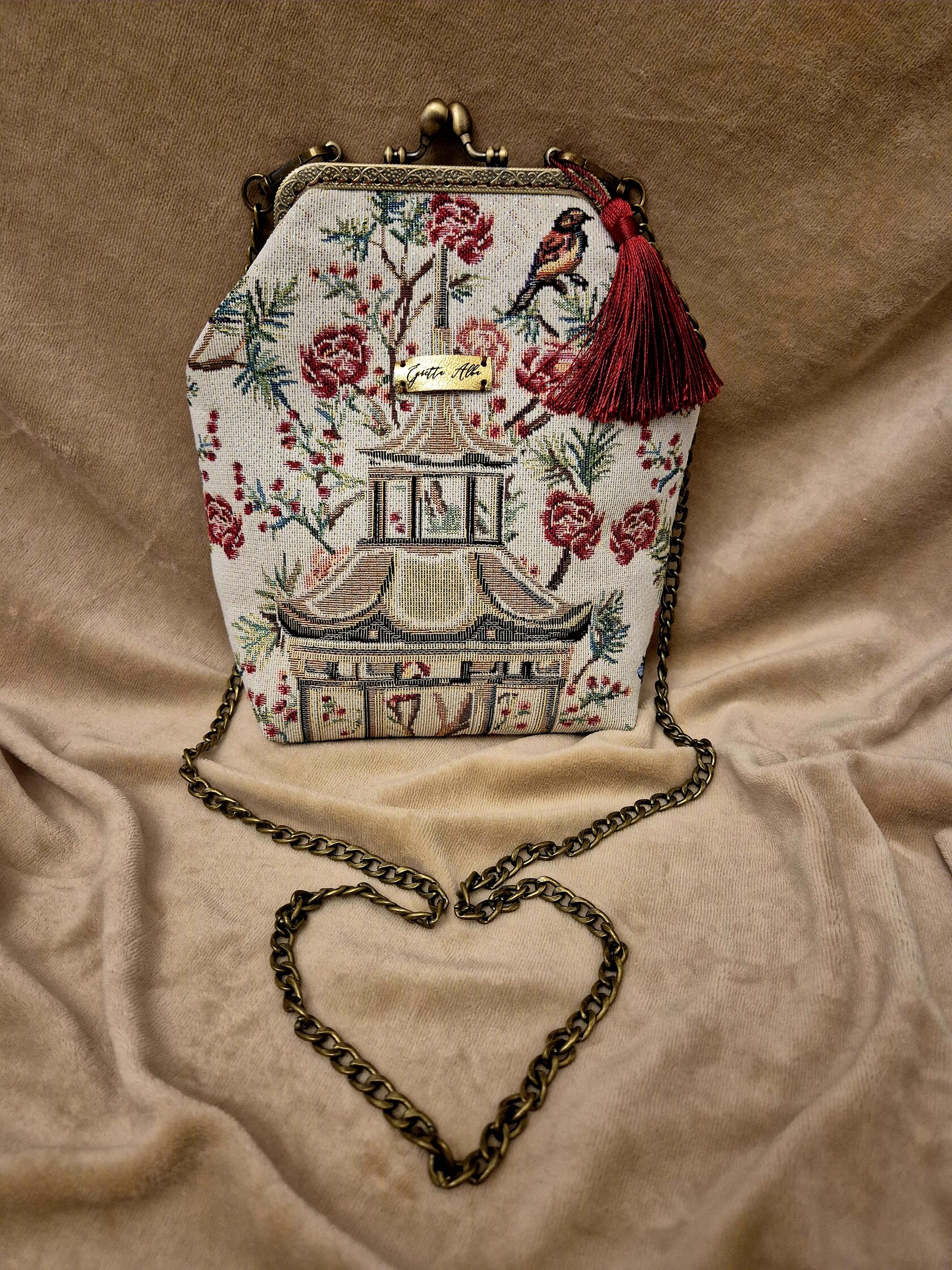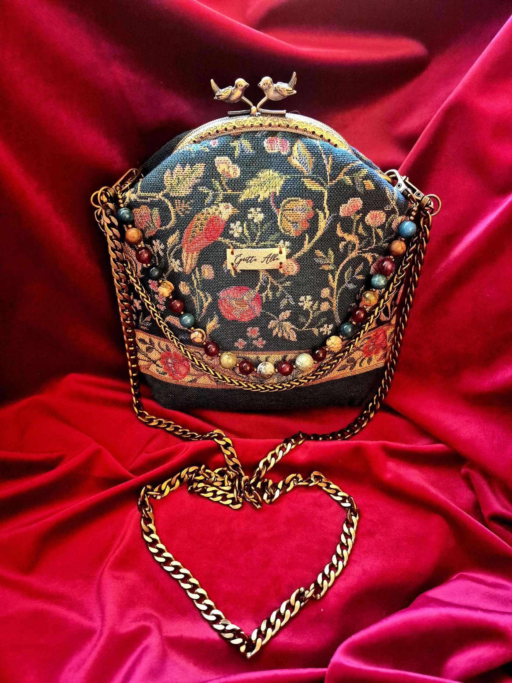Фермуар, цепочка: бронзированный металл. Корпус: гобелен, атлас. 23×18×8